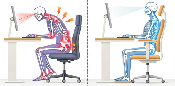 しかし、長時間のデスクワークや猫背の姿勢が続くと、このバランスが崩れ、腰や肩・首に負担が集中してしまいます。