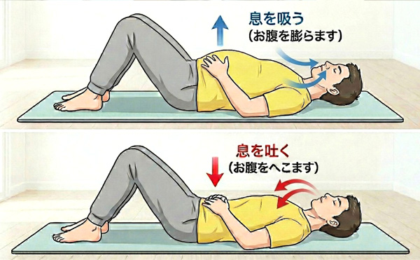 ①鼻から大きく息を吸い込んでいき、お腹の上に置いた手を押すようにお腹を膨らませていく。